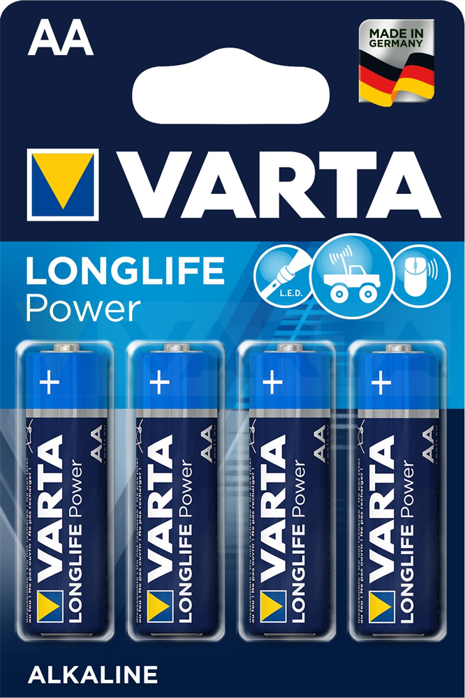 VARTA LONGLIFE POWER упакована в удобный, прочный и вместительный блистер, содержащий 4 элемента питания типа АА.