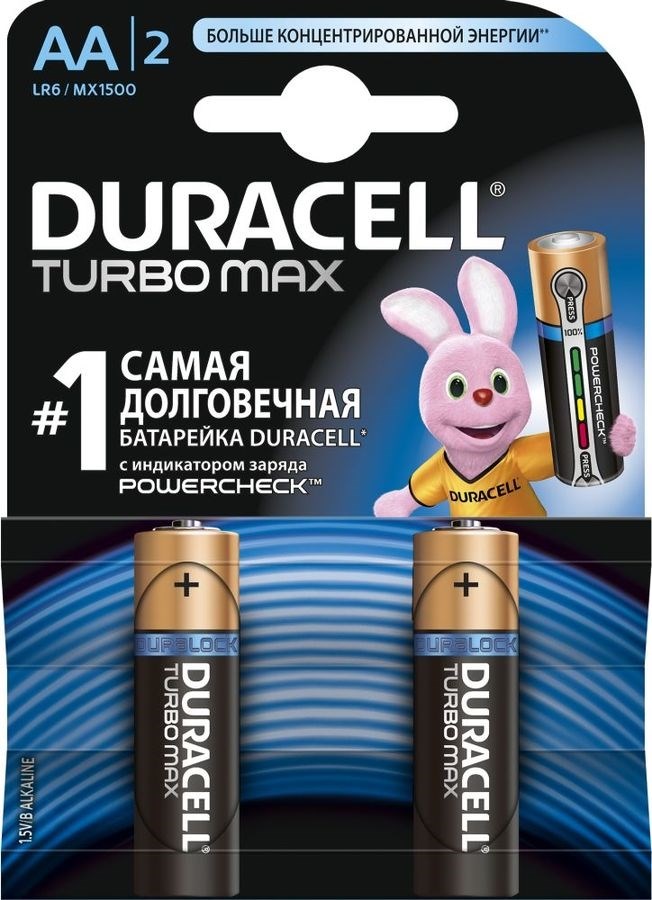 Батарейки Duracell Turbo Max LR6/АА упакованы в удобный, прочный картонный блистер, вмещающий 2 элемента питания типа АА.