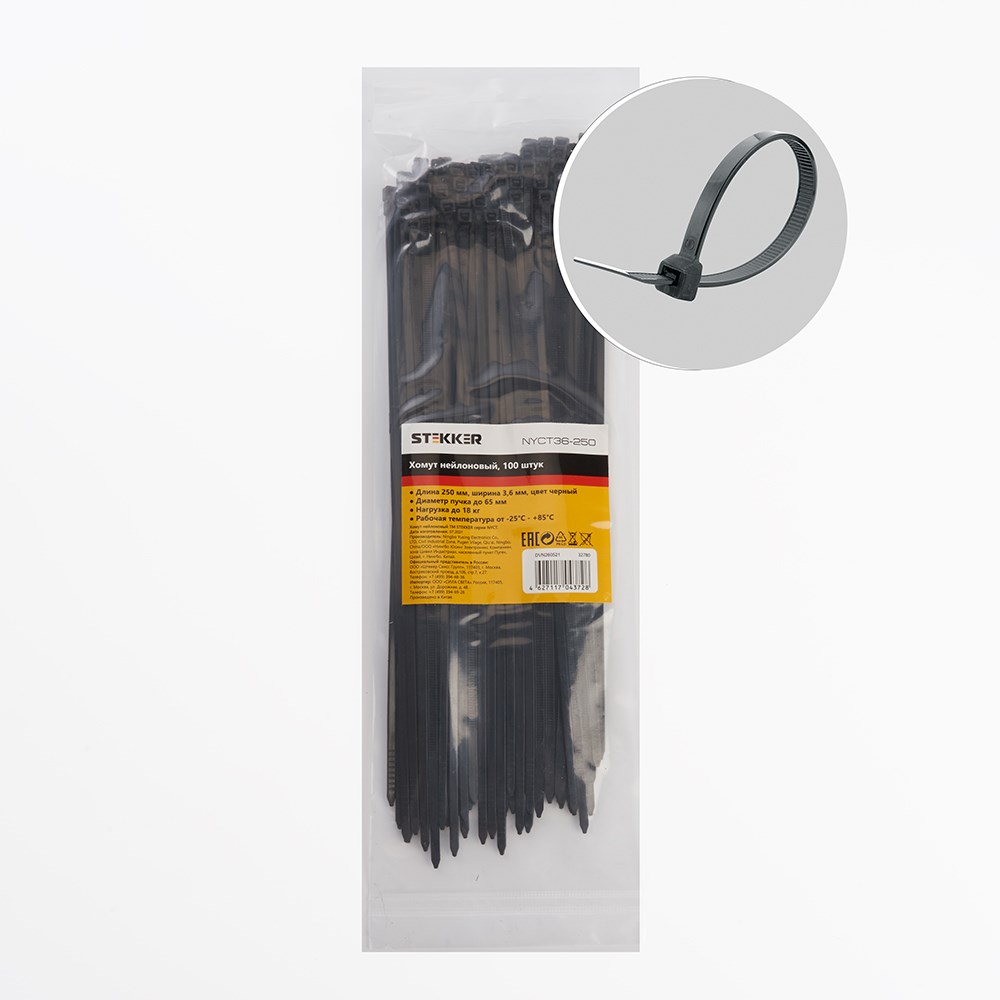 Хомут электромонтажный STEKKER NYCT36-250 , одноразовый, черный, материал - нейлон , размер 3,6*250мм, максимальный диаметр пучка - 65мм, нагрузка - 18кг, диапазон рабочих температур -25°C - +85°C, рекомендуемая температура хранениня +5°C - +25°C