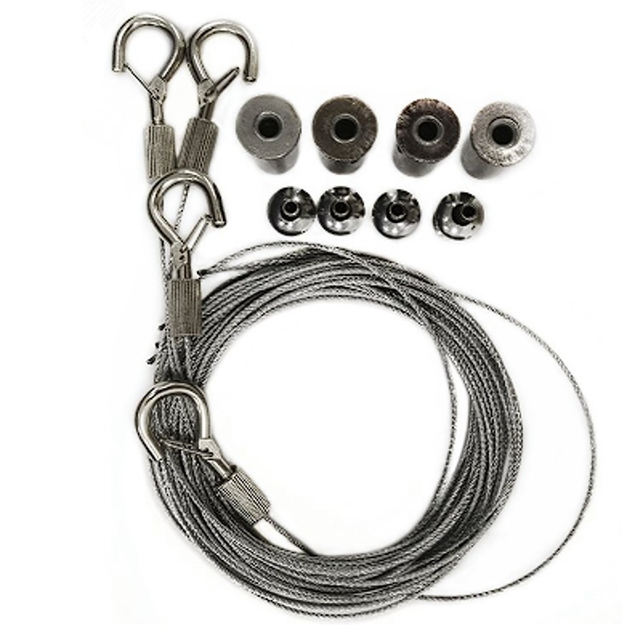 Каждый комплект состоит из тросов требуемой длины (1.5/2/3/5м), также включает в себя все необходимые крепёжные элементы, рассчитанные минимум на 4 точки крепления для создания стабильного, безопасного и надёжного монтажа.