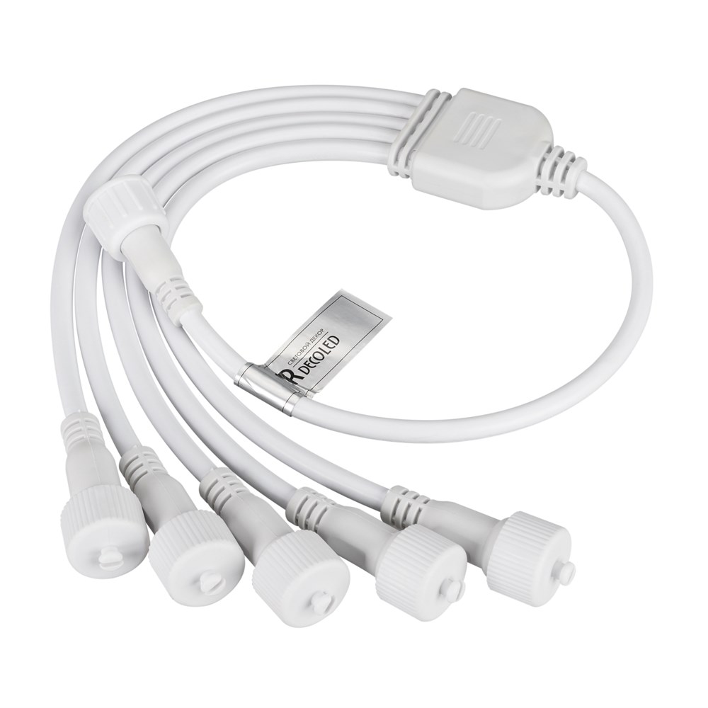 Коннектор питания (PLC сплиттер) разработан специально для подключения гирлянд серии RGB-SYNC. Оболочка из белого ПВХ придает ему элегантный внешний вид. Входное напряжение составляет 230V DC. Коннектор обеспечивает питание и сигнал на входе и выходе. Он имеет 5 выходных портов, каждый из которых поддерживает управление до 1400 RGB светодиодов. Общая поддержка управления составляет до 7000 светодиодов.