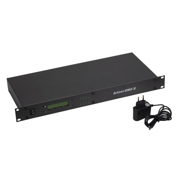 DMX-ArtNet контроллер: выход DMX 512 (512x8=4096 канала), работает по протоколу: ArtNet, DMX512, размеры L482xW200xH44 mm. Вес 2,2 кг.