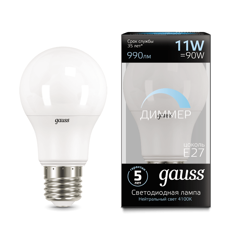 Лампа Gauss A60 11W 990lm 4100К E27 диммируемая LED 1/10/50