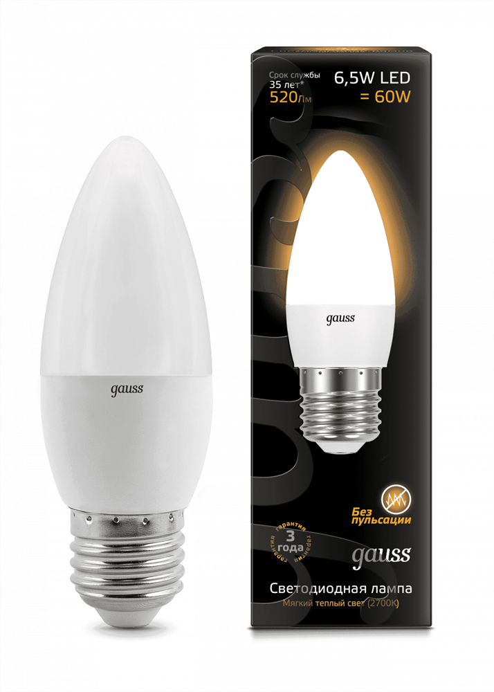 Лампа Gauss Свеча 6.5W 520lm 3000К E27 LED 1/10/100