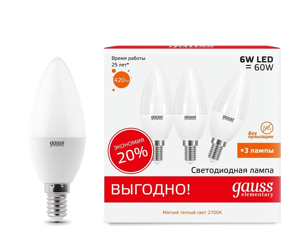 Лампа Gauss Elementary Свеча 7W 450lm 2700K E14 (3 лампы в упаковке) LED 1/40