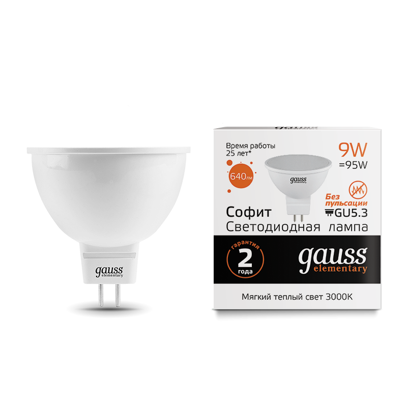 Лампа Gauss Elementary MR16 9W 640lm 3000K GU5.3 LED 1/10/100