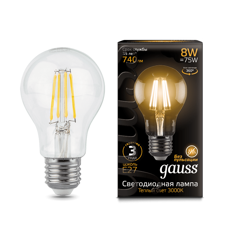Лампа Gauss Filament А60 8W 740lm 3000К Е27 LED 1/10/40