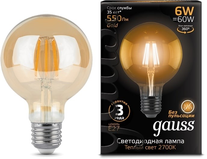 Лампа Gauss Filament G95 6W 550lm 2400К Е27 golden LED 1/20