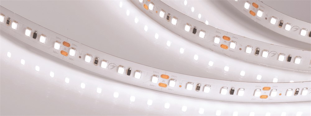 Стабилизированная лента длиной 20 метров и шириной 12 мм. Стабилизаторы тока обеспечивают равномерное свечение по всей длине ленты даже при подключении только с одной стороны. Светодиоды SMD 2835 (120 шт/м) белого цвета свечения (5800–6500 K) с индексом цветопередачи CRI>85. Мощность 9.6 Вт/м, напряжение питания 24 В. Подсветка потолочных ниш, декоративная подсветка, создание контуров рекламных объектов. Совместима с любыми диммерами (ШИМ). Минимальный отрезок 50 мм (6 светодиодов).