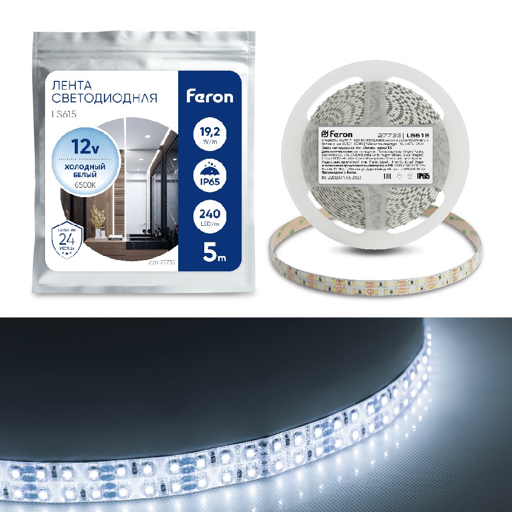 Лента светодиодная 12V FERON LS615, 240*SMD2835, 19,2W/m, IP65, 6500К (дневной), кратность резки 25