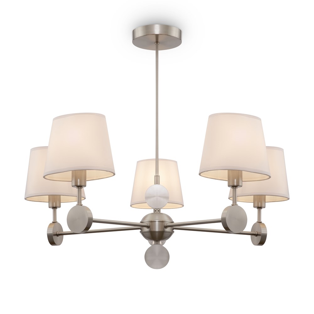 Металлическая арматура. Цвет – никель. Сатиновые абажуры оригинальной формы. Актуальное сочетание геометричных линий и округлых силуэтов. Одиночный подвес с цоколем Е27, лампа, бра и люстры – Е14.