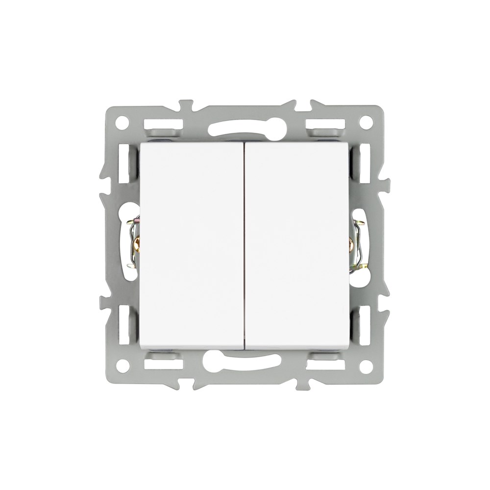 Механизм выключателя света двухклавишный на 1 пост, совместим с рамками серий VERSA/GLARE/PRESTO. Скрытый тип монтажа позволяет гармонично встроить в интерьер любого современного дизайн-проекта. Видимая часть механизма выполнена из высококачественного тугоплавкого пластика белого цвета. Контактная часть присоединяется при помощи винтовых зажимов, а усиленные монтажные лапки надежно фиксируют механизм в установочном подрозетнике. Степень защиты IP44 допускает использование устройства во влажных помещениях, с соблюдением требований эксплуатации.