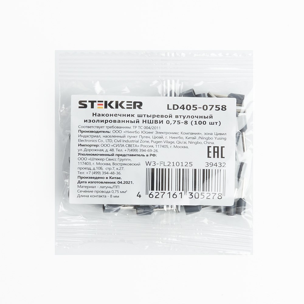Наконечник штыревой втулочный изолированный НШВИ 0,75-8 (ОПТ упаковка 100 шт), LD405-0758