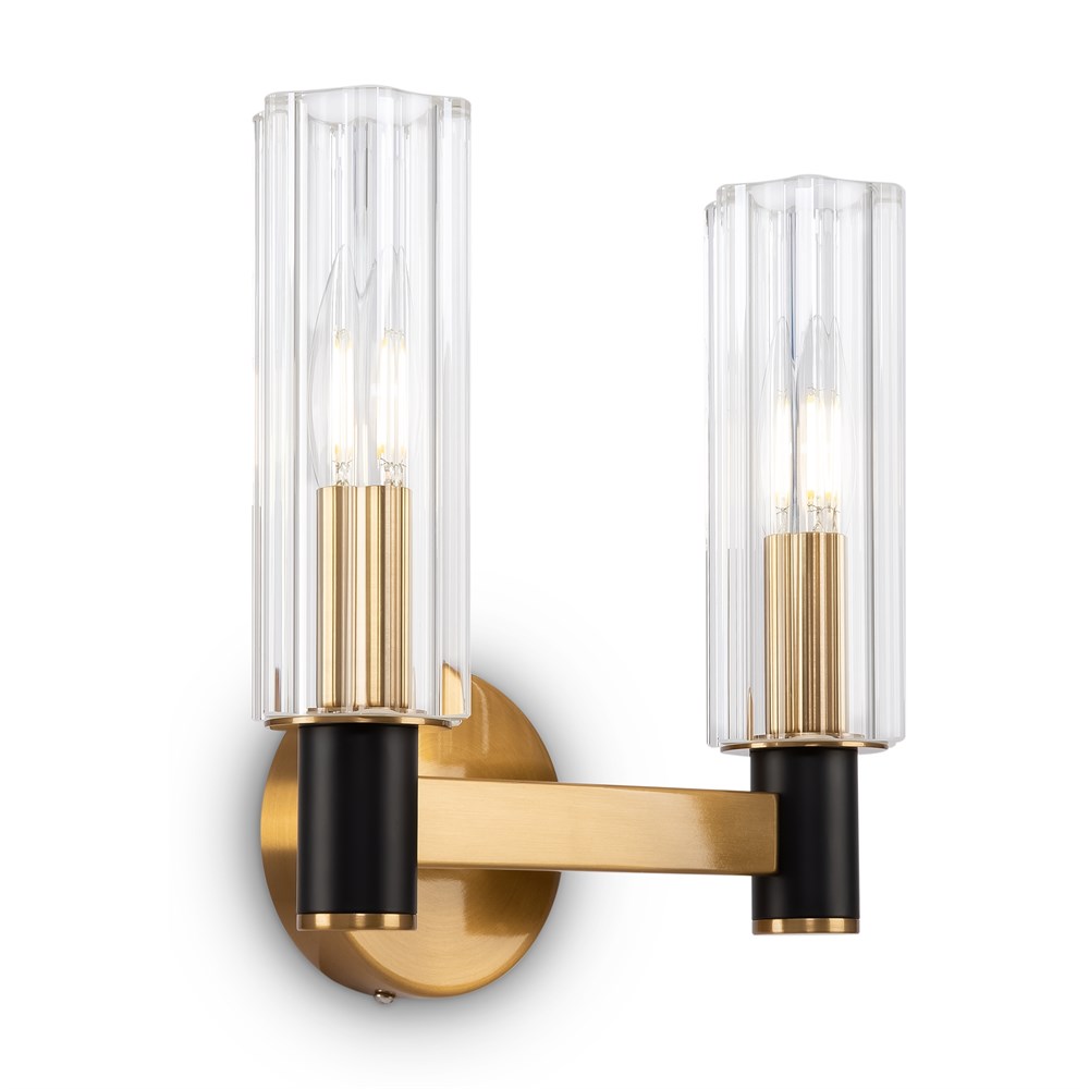 Арматура из металла сочетает два оттенка: черный и латунь. Плафоны цилиндрической формы выполнены из рельефного прозрачного стекла. Актуальная геометрия с настроением американской классики. Источник света – лампа с цоколем E14.
