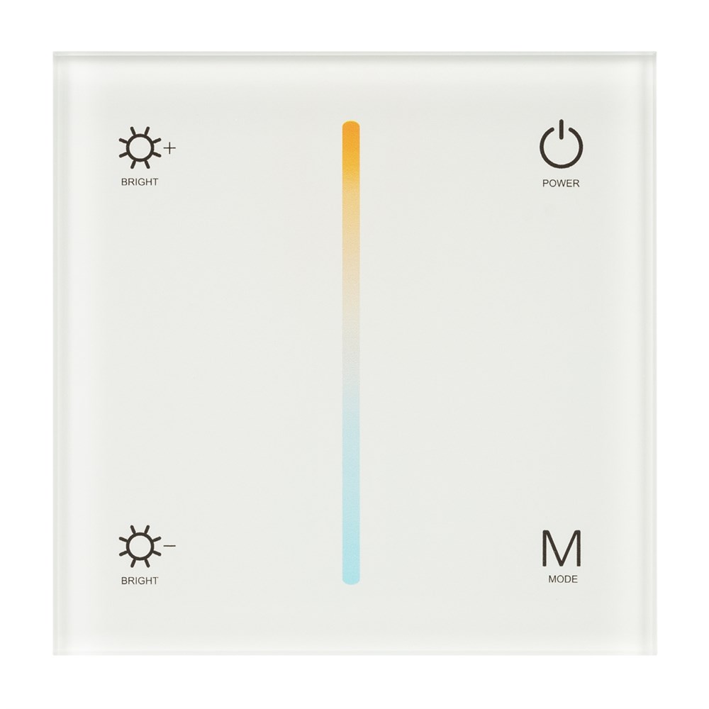 Встраиваемая сенсорная панель белого цвета из стекла, с защитой от мелких царапин. Предназначена для управления мультибелыми (MIX) источниками света (ШИМ) с помощью сенсорной полосы. Основные функции: включение/выключение света, регулировка яркости, изменение цветовой температуры. Изделие можно использовать как диммер с 2 парами параллельных выходов для подключения мультибелых светодиодных лент. Возможно применение как однозонный пульт дистанционного управления диммерами и контроллерами серии SMART. Устройство может управляться пультами дистанционного управления или другими панелями серии SMART. К одной панели возможно привязать неограниченное количество диммеров и контроллеров, совместима с диммерами и контроллерами серии SMART, с управлением по радиоканалу 2.4G. Питание 12-24В, 4 канала управления, максимальный ток 3А на канал, суммарная мощность нагрузки 144-288 Вт. Габариты: 86х86х37 мм, корпус пластика, лицевая часть из стекла. Установка в монтажные коробки стандартного размера.