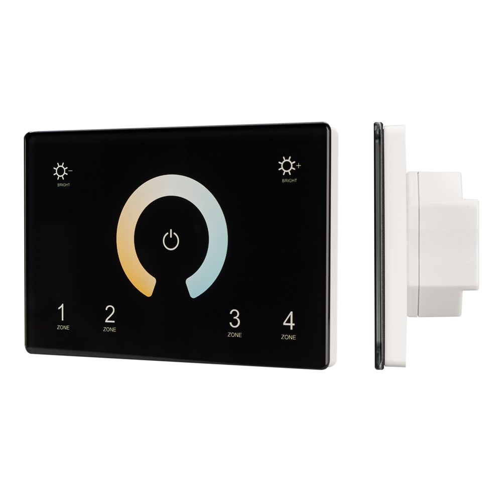 Встраиваемая сенсорная панель в "итальянском" стиле, изготовленная из высококачественного стекла, защищенного от появления царапин. Изделие позволяет осуществлять основные функции управления светом: включение/выключение, регулировка яркости, регулировка цветовой температуры, сохранение предустановок для 4 световых зон. Панель совместима с диммерами и контроллерами SMART по радиоканалу 2.4G (количество привязываемых диммеров и контроллеров не ограничено) и может управлять DMX-диммерами по проводной шине DMX512. Выходной сигнал DMX соответствует стандартному протоколу DMX512 и совместим с оборудованием DMX любого производителя. Панель чёрного цвета, питание от сети 230В. Габариты устройства 120х80х37 мм, встраивается в стандартную монтажную коробку.