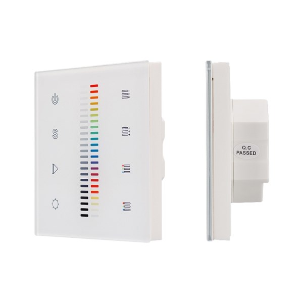 Встраиваемая стеклянная белая Touch-панель с сенсорным слайдером, 4 зоны, 1-2 зона DIM, 3-4 зоны RGB. Управление – по радиоканалу (совместимы с контроллерами SR-1009x). Питание 220 В. Размер 86x86x29 мм. Аналогичные по дизайну панели в серии SMART (устройства не совместимы).