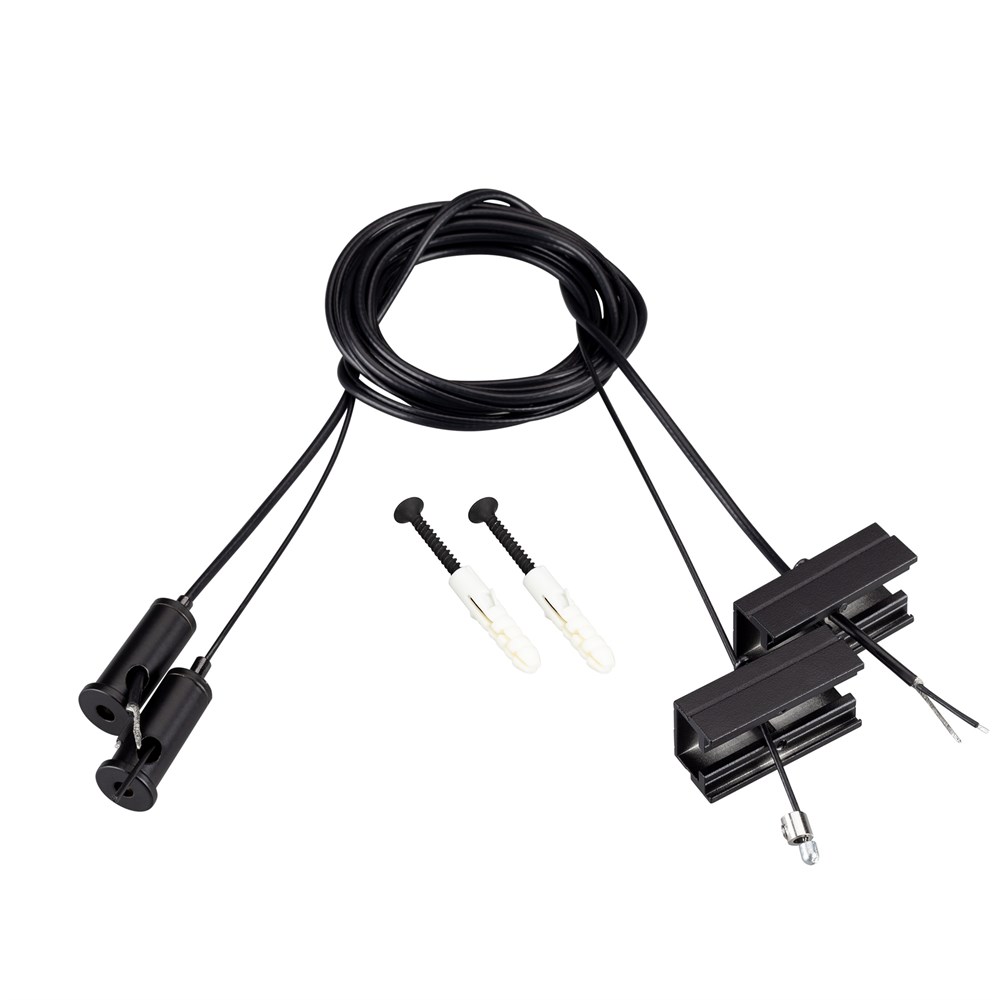 Подвесное регулируемое крепление черного цвета для профиля SL-LINE-25100-DUAL с токопроводящим кабелем. В комплекте: трос 2м -1шт, трос 2м с токопроводящим медным сечением - 1шт. (сечение кабеля - 2х0.5 мм²), тросовый держатель, фиксатор для троса.