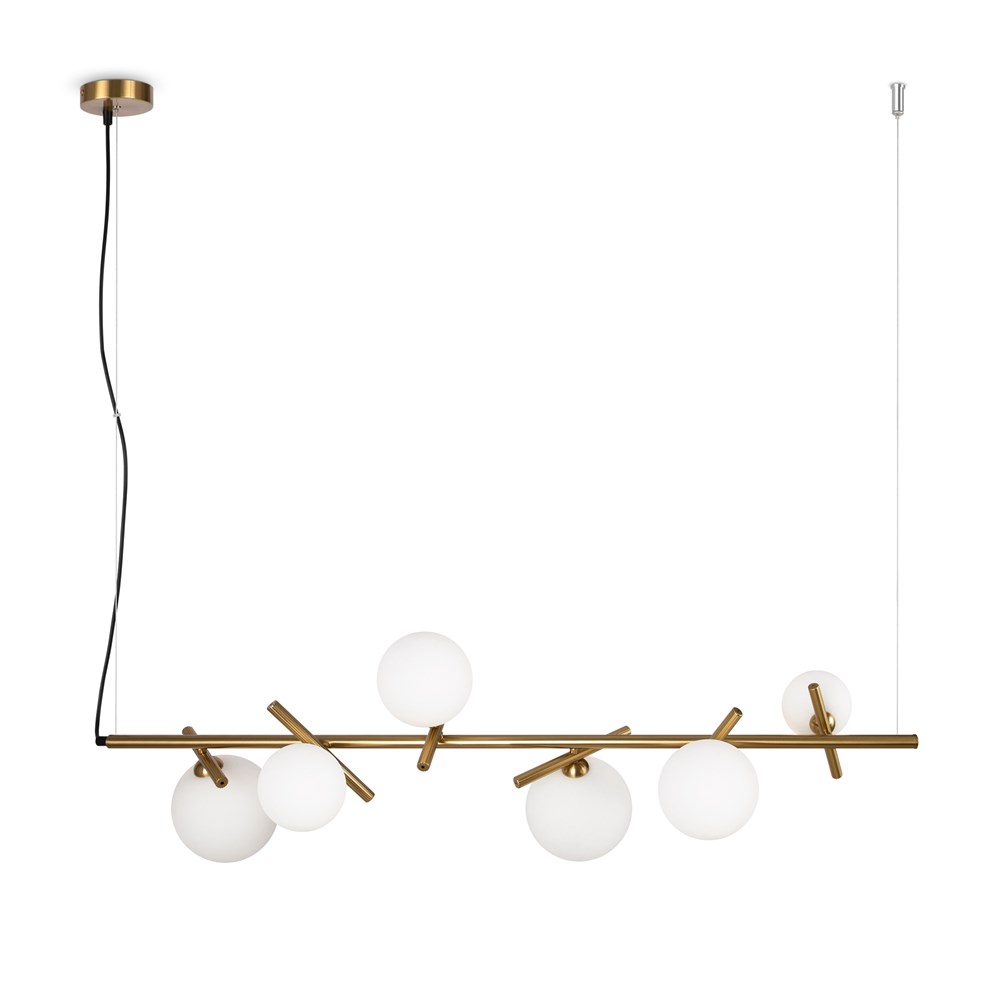 Материал арматуры — рифленый металл, цвет — латунь. Плафоны-сферы из белого матового стекла для мягкого заливающего света. Воздушный образ плафонов, строгие тонкие линии арматуры придадут интерьеру изящество и легкость. Высота подвесов регулируется. Источник света — лампы с цоколем G9.