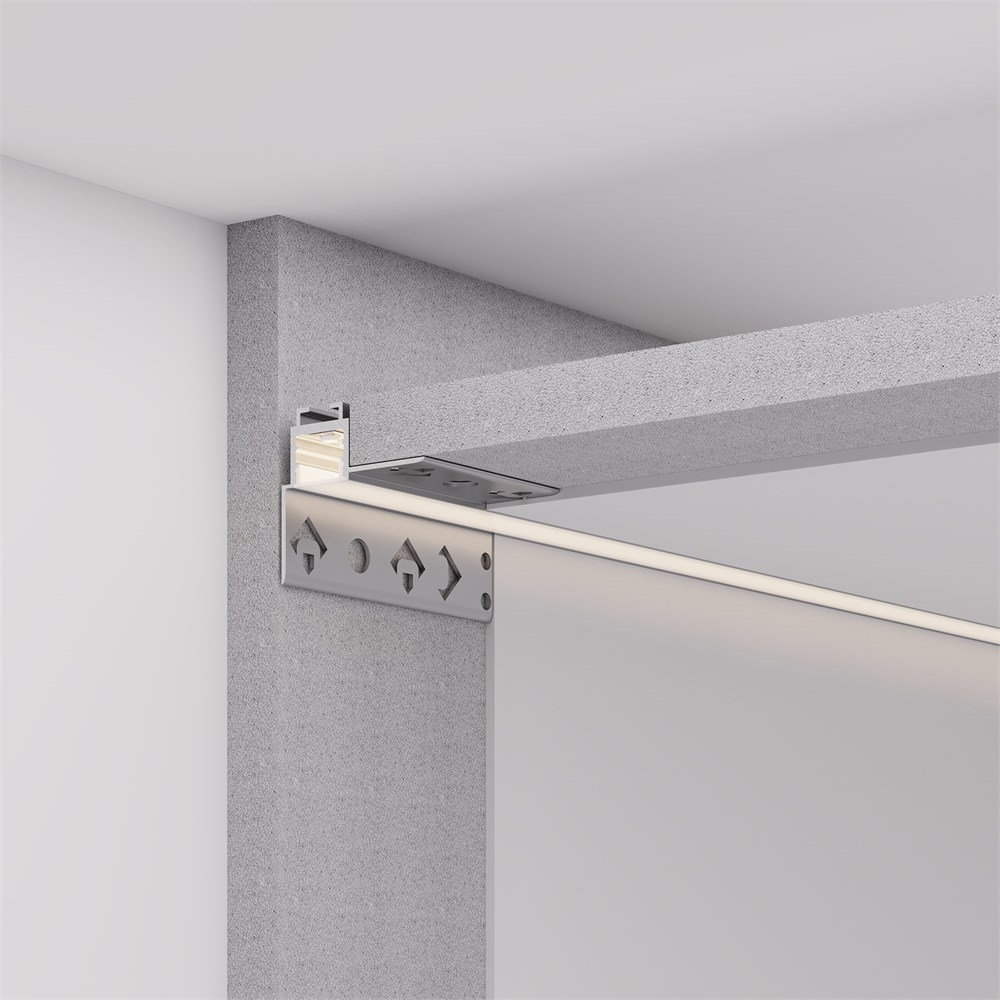 Встраиваемый профиль со скрытым фланцем под строительную отделку из анодированного алюминия для контурной подсветки ниш, карнизов и углов.