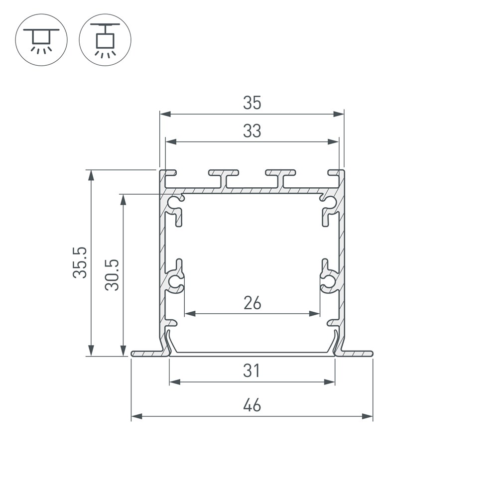 Габаритные размеры профиля составляют 2000 мм в длину, 46 мм в ширину и 35,5 мм в высоту. Площадка для установки светодиодных лент позволяет использовать ленту шириной до 26 мм и мощностью до 37 Вт/м. Это обеспечивает гибкость в выборе светодиодных лент и создает потрясающие световые решения.