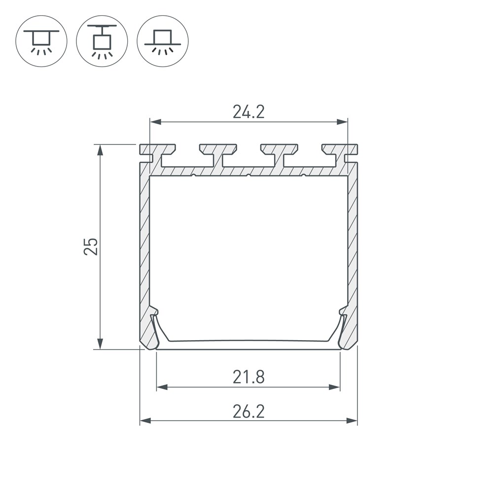 Габаритные размеры профиля составляют 3000 мм в длину, 26,2 мм в ширину и 25 мм в высоту. Площадка для установки светодиодных лент позволяет использовать ленту шириной до 24,2 мм и мощностью до 26,2 Вт/м. Это обеспечивает гибкость в выборе светодиодных лент и создает потрясающие световые решения.