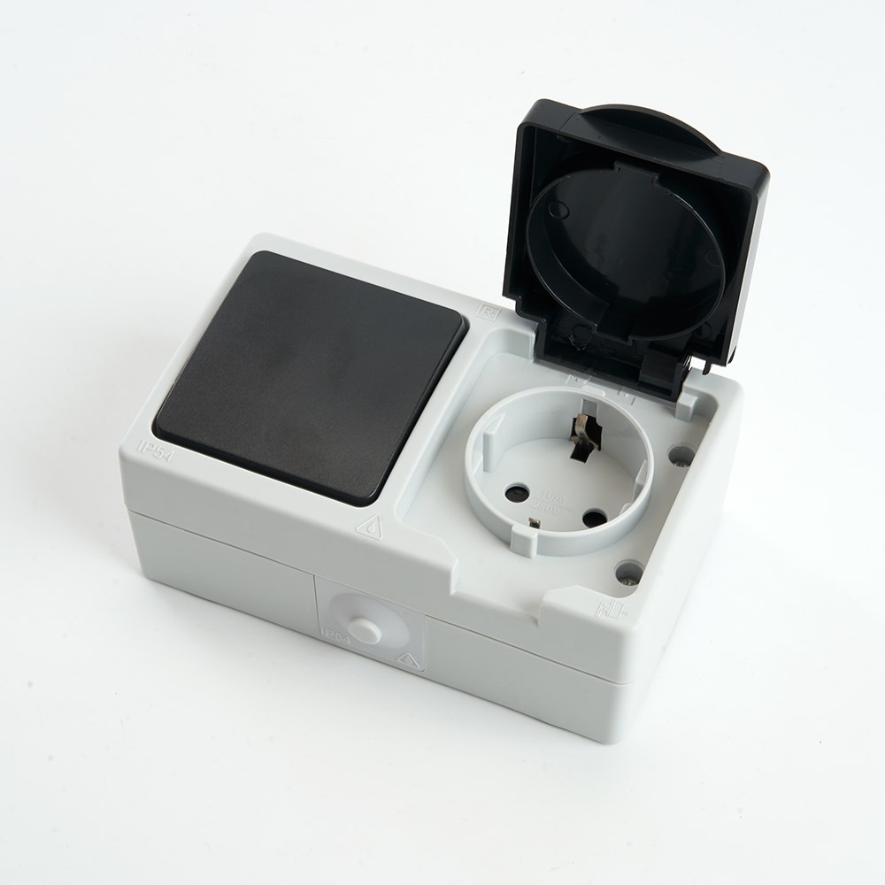Розетка открытой установки STEKKER PST16-11-54/10-111-54 (блок с выключателем одноклавишным однополюсным, расn-ие между монтажн. отверстиями: по гориз. - 113мм, по вертик.- 65мм) на 1 гнездо, с крышкой, с заземлением. Материал: полипропилен, цвет серый-графит, размер 80*130*55мм. Номинальное напряжение 250В, номинальный ток 16А, диапазон рабочих температур 0..+40°C, IP54