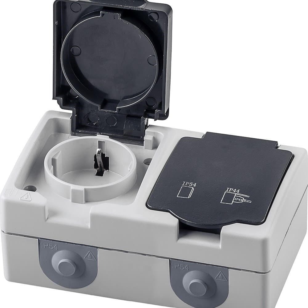Розетка открытой установки STEKKER PST16-12-54 (расстояние между монтажн. отвер-ми: по гориз. - 113мм, по вертик.- 65мм) на 2 гнездо, с крышкой, с заземлением. Материал: ABS пластик, цвет серый-графит, размер 80*130*55мм. Номинальное напряжение 250В, номинальный ток 16А, диапазон рабочих температур 0..+35°C, IP54