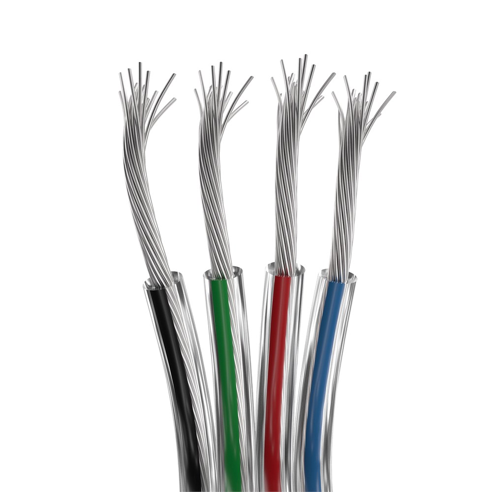 Шлейф для питания и управления мультицветными (RGB) светодиодными лентами обеспечивает бесперебойное питание и контроль для вашего светодиодного освещения. Четыре проводника изготовлены из высококачественной луженой меди с калибром 18AWG и сечением 0,84 мм². Внешняя оболочка из прочного прозрачного ПВХ обеспечивает дополнительную защиту и простоту идентификации. Катушка длиной 50 метров позволяет без проблем прокладывать провода в соответствии с вашими потребностями в освещении.