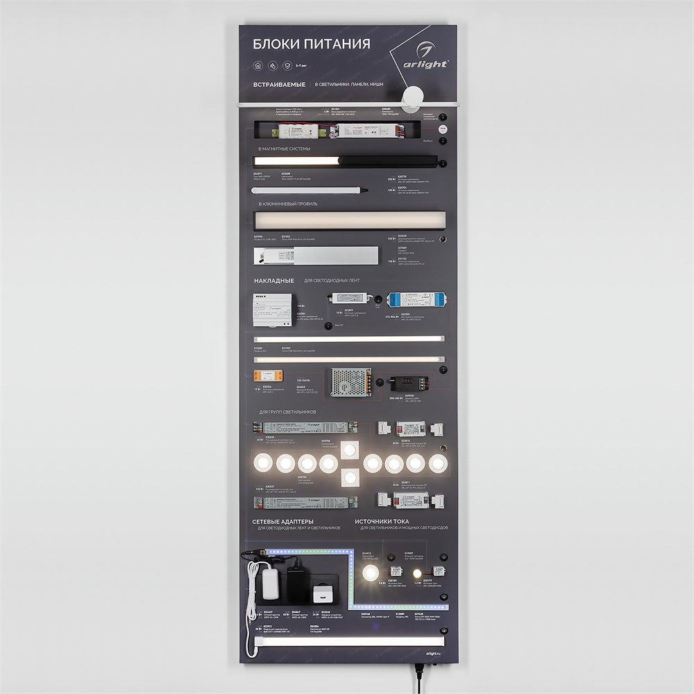 На стенде представлен широкий ассортимент блоков питания Arlight для различных источников освещения: светодиодные ленты, светильники, мощные светодиоды и т. п. Показаны варианты встройки блоков питания в ниши и в профиль. Реализован механизм плавного включения светодиодной ленты.