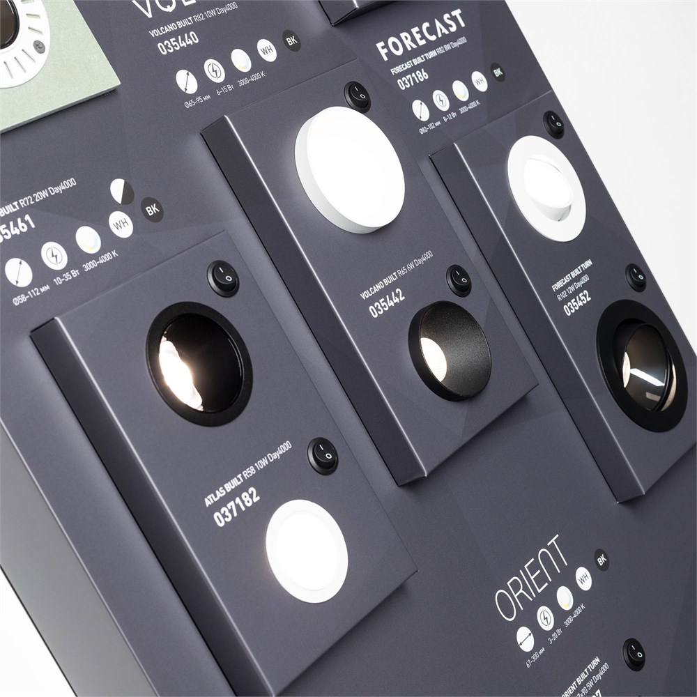 На стенде представлены встраиваемые светильники-даунлайты, серии STORM, FROST, LEGEND, CYCLONE, POLAR, EXPLORER, ATLAS-TRIMLESS, ATLAS, VOLCANO, ORIENT-BUILT.