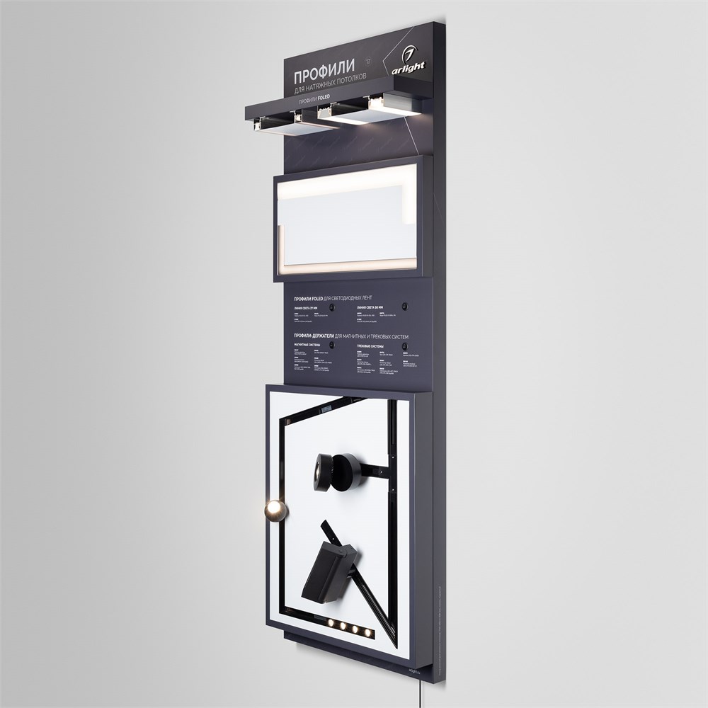 На стенде представлен ассортимент профилей Arlight для натяжных потолков: