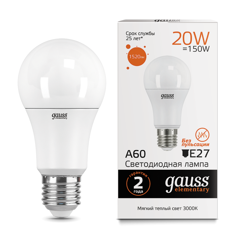 Лампа Gauss Elementary A60 20W 1520lm 3000K E27 LED 1/10/50