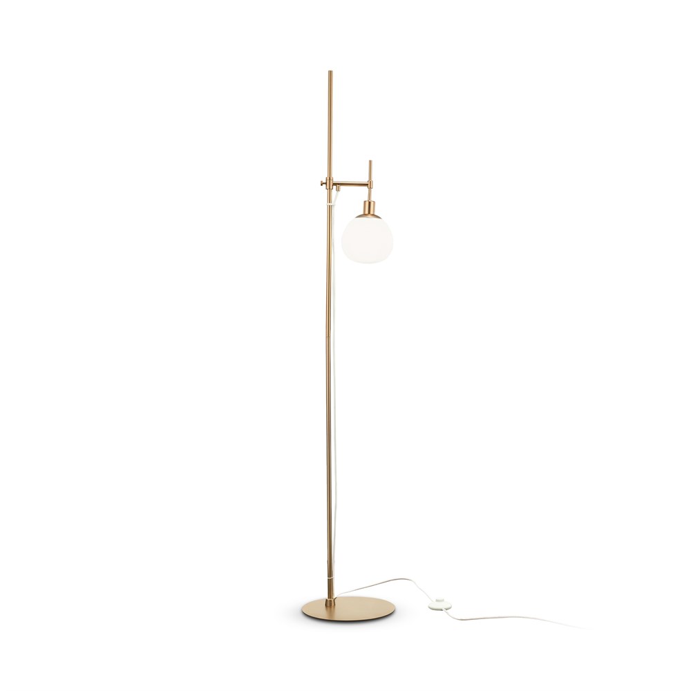Металлическая арматура, оттенки – никель, латунь. Плафоны – выдувное стекло белого цвета. Широкая семья. У торшера и настольной лампы можно изменять положение плафона. Регулируемая высота.