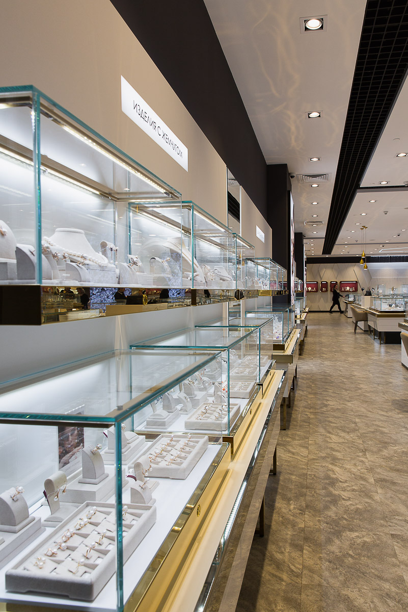 Освещена сеть магазинов сети Московского Ювелирного Завода, в том числе и флагманский в ТЦ Афимолл. Данный проект - это премиальный ювелирный бутик. Ключевая задача - соблюсти все светотехнические параметры для beauty ритейла.